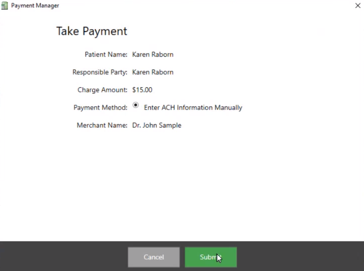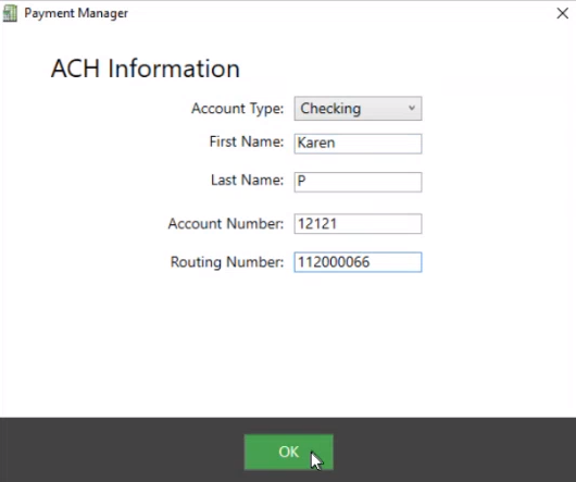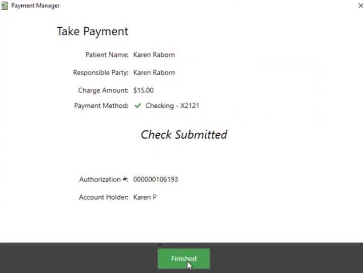 Enter information in the fields and click OK. When processing is complete, the Take Payment window shows that the check has been submitted.