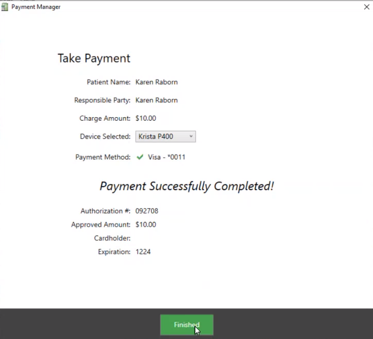 When the payment is approved, the Payment Successfully Completed! window is displayed.