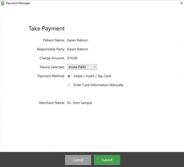 Click Submit. The Take Payment window is displayed, and you are prompted to insert, swipe, or tap the card.