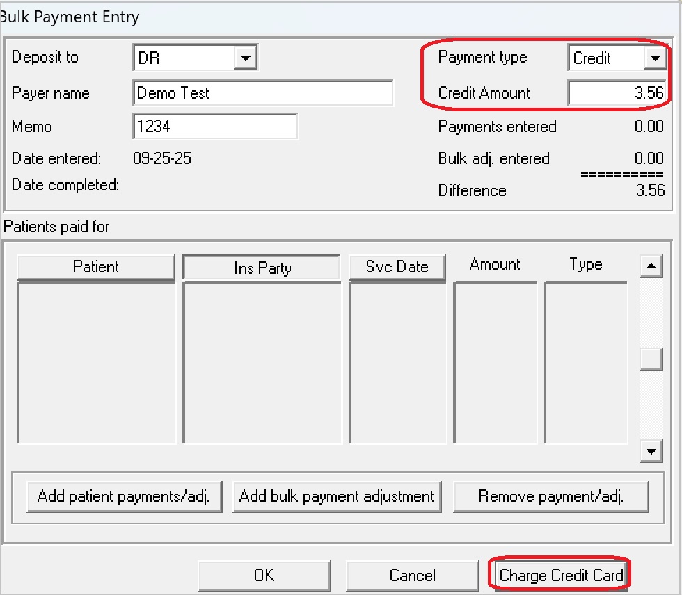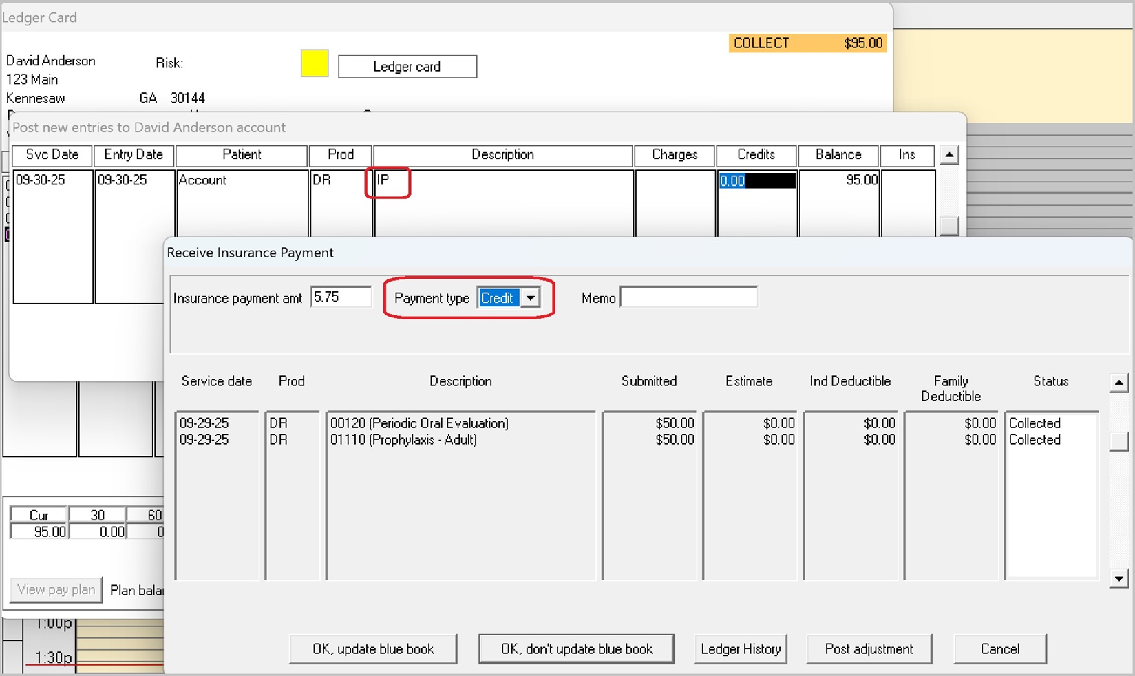 Enter the Insurance payment amt and then select a Payment Type of Credit.