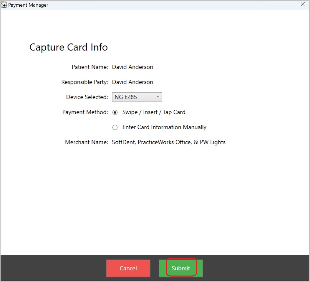 Click Pay with Credit Card. The Payment Manager Capture Card Info screen is displayed.