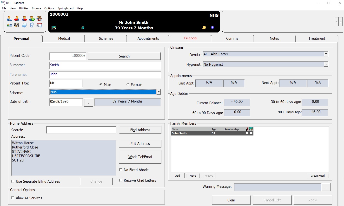 Patient Code — Generated automatically by the system. Type a patient's code and click Search to fill in the fields OR click Search and type the patient's surname.