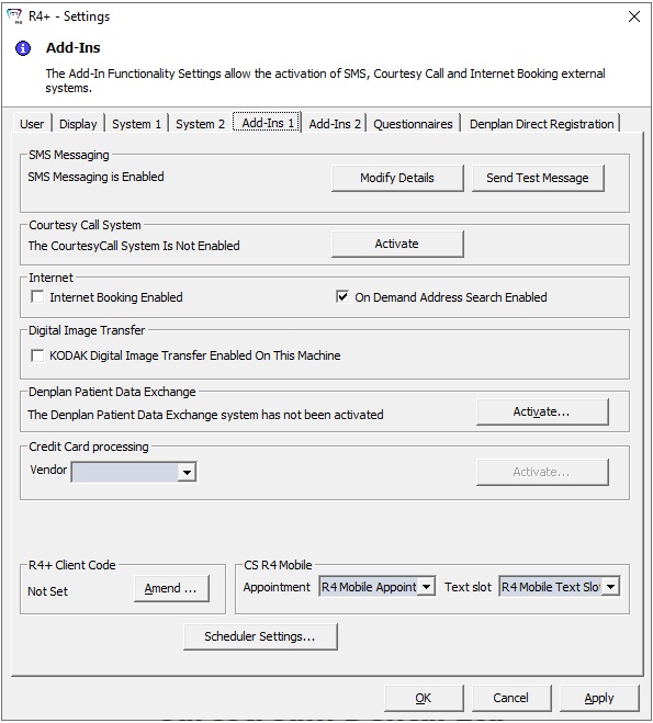 Activate — Click this button to display the R4+ - Client Code window. A client code is required to activate the Courtesy Call system, the Denplan Messaging system, and R4+ integration with Steritrak.