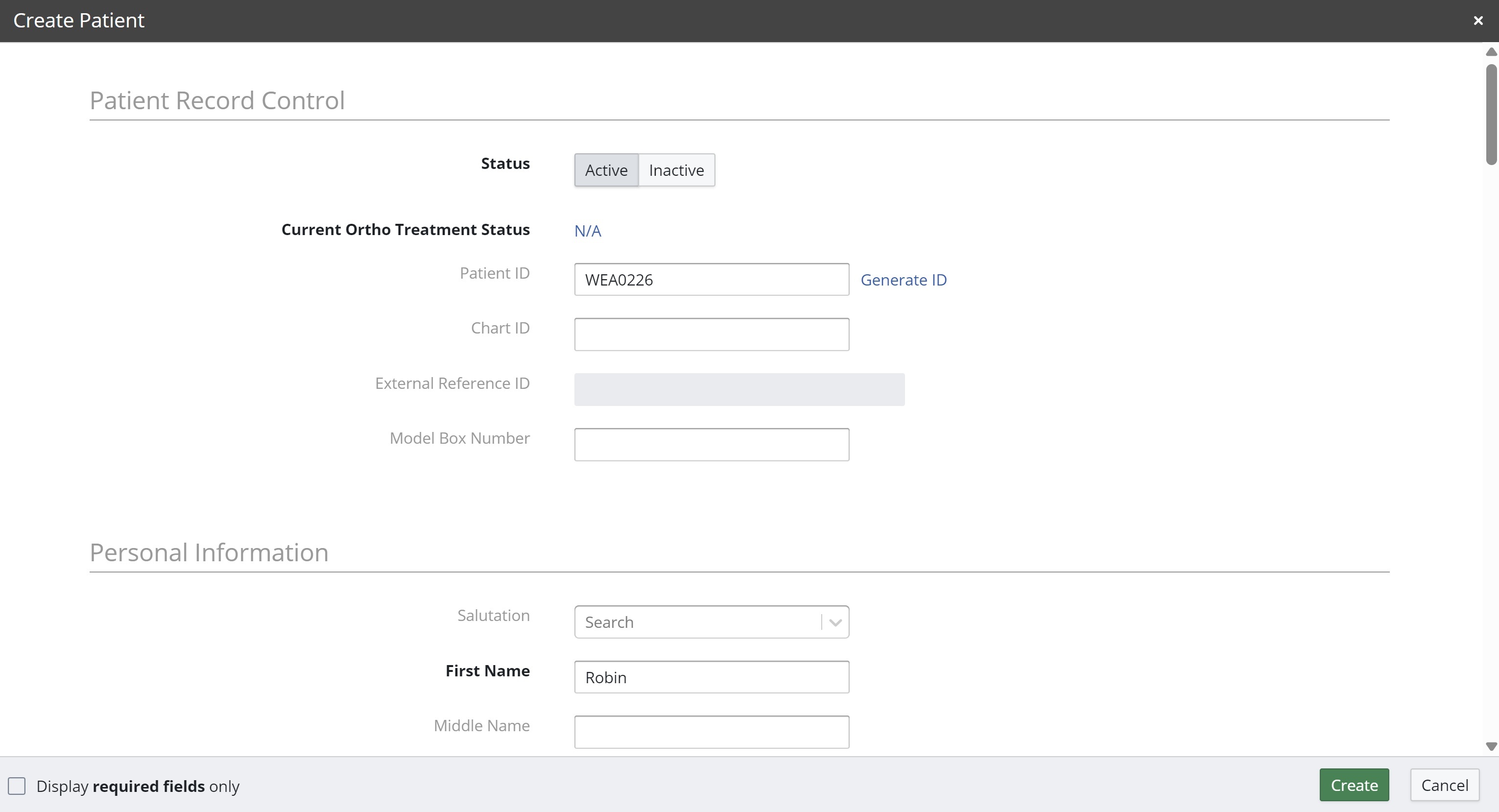 In the Patient Record Control section, verify that the patient is Active and add a Patient ID. You can manually enter a patient identification number or click Generate ID to generate the ID automatically.