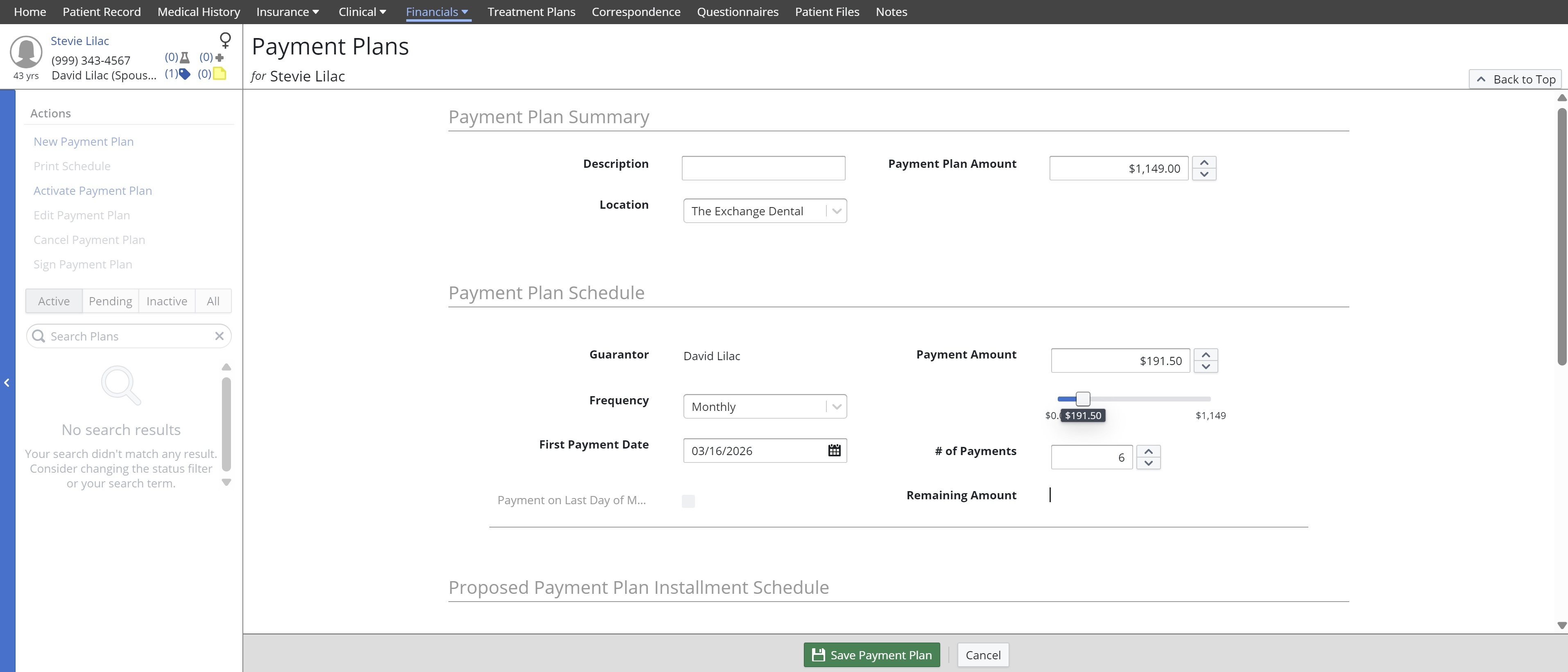 Print Schedule: Create a PDF of the schedule for the selected payment plan, and you can then print or email it to the patient.