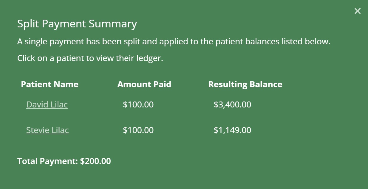 Click Post Payment. The Split Payment Summary window is displayed for reference. You can select any patient to view his or her ledger.