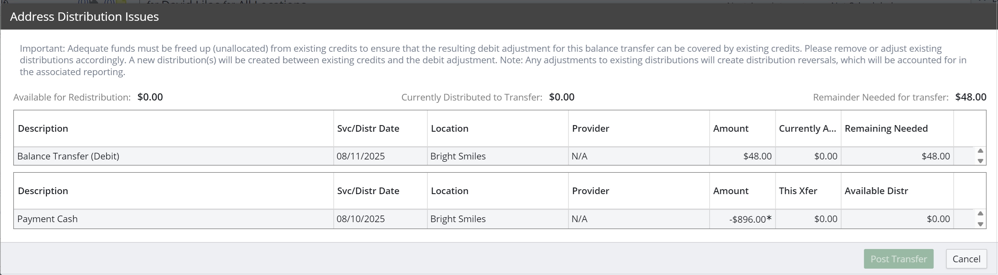Note: Prior to initiating a balance transfer, we recommend that you make sure that there are enough unapplied funds from the associated location's credits (i.e., payments, discounts, write-offs) to cover the amount of the balance transfer. Distributions from existing credits with available funds are automatically created to cover the new (balance transfer) debit.