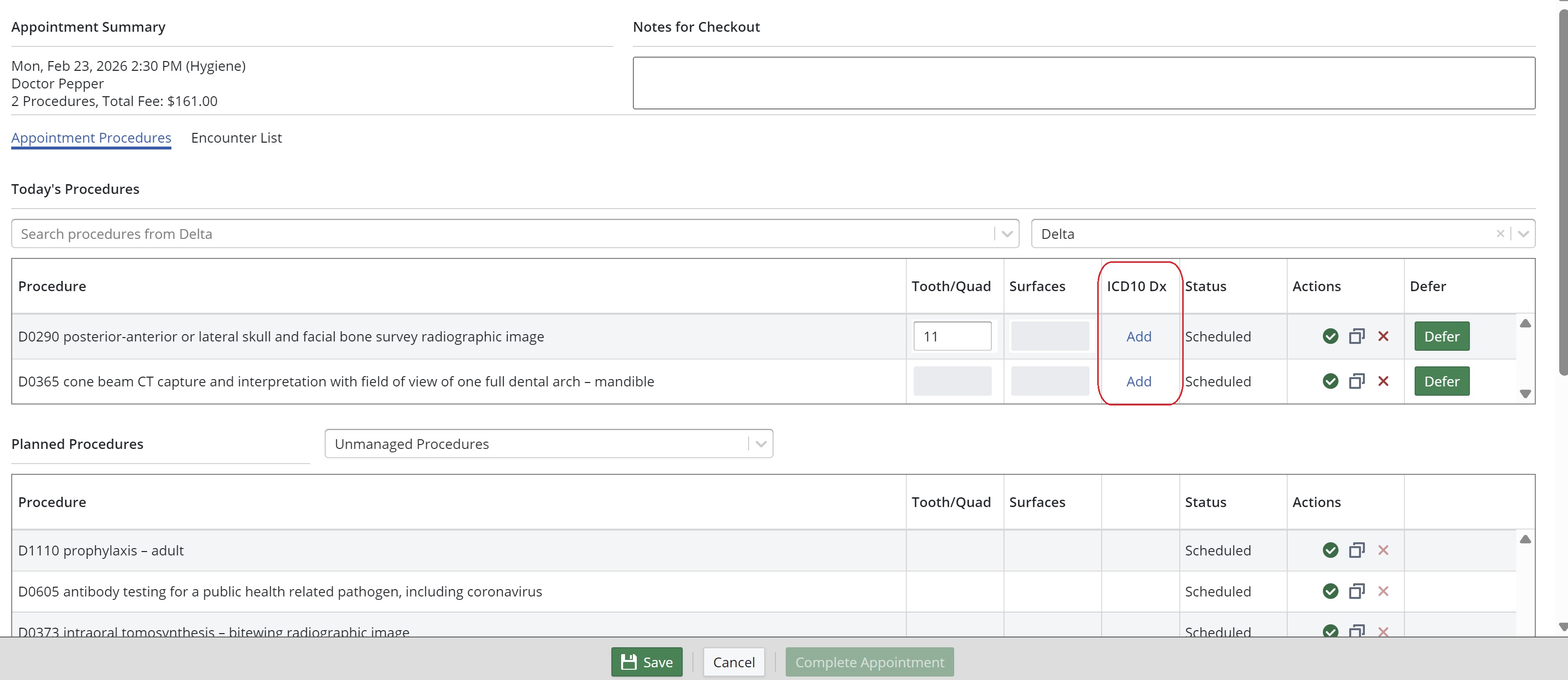 When ICD-10 codes are enabled, a column is added to the interface where procedures are managed.