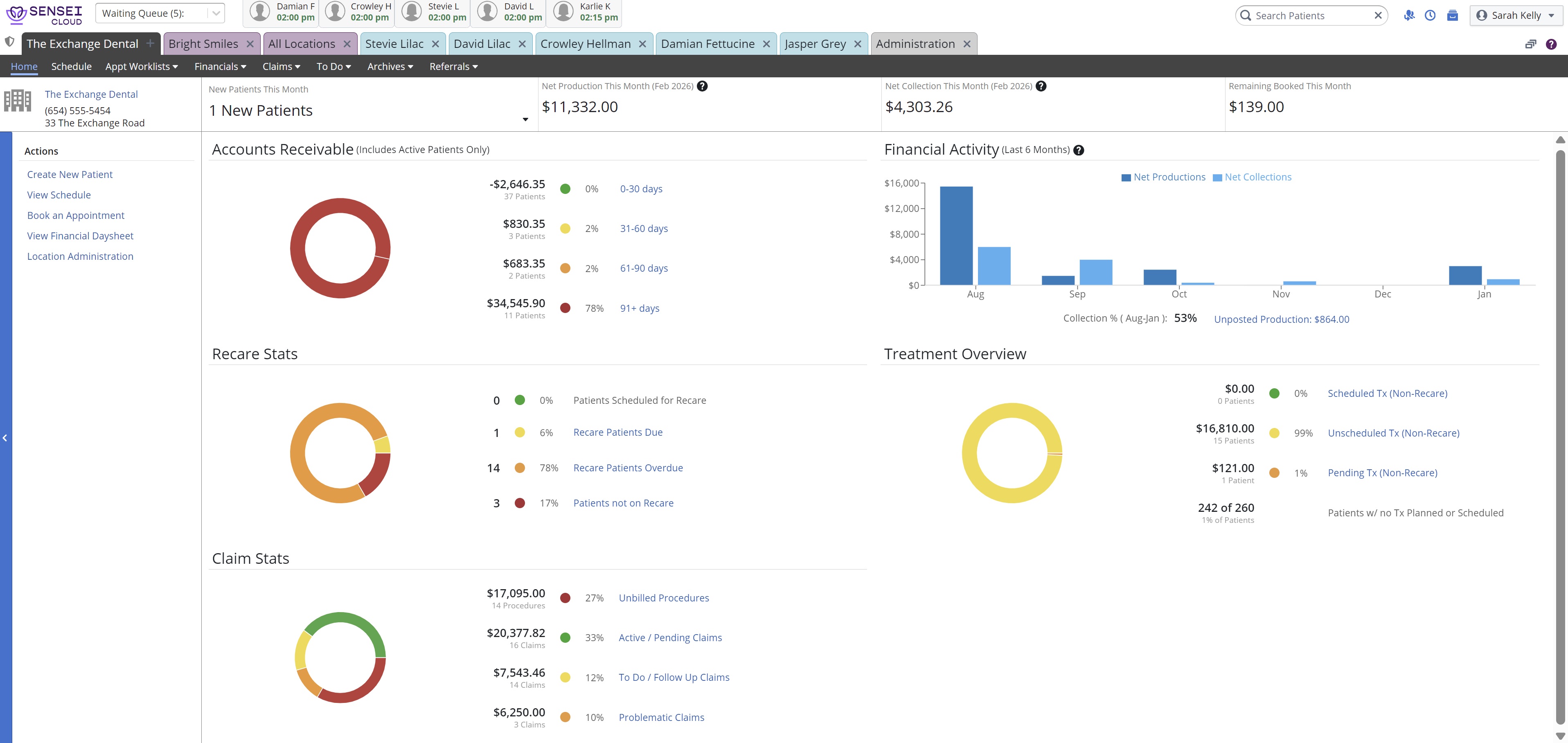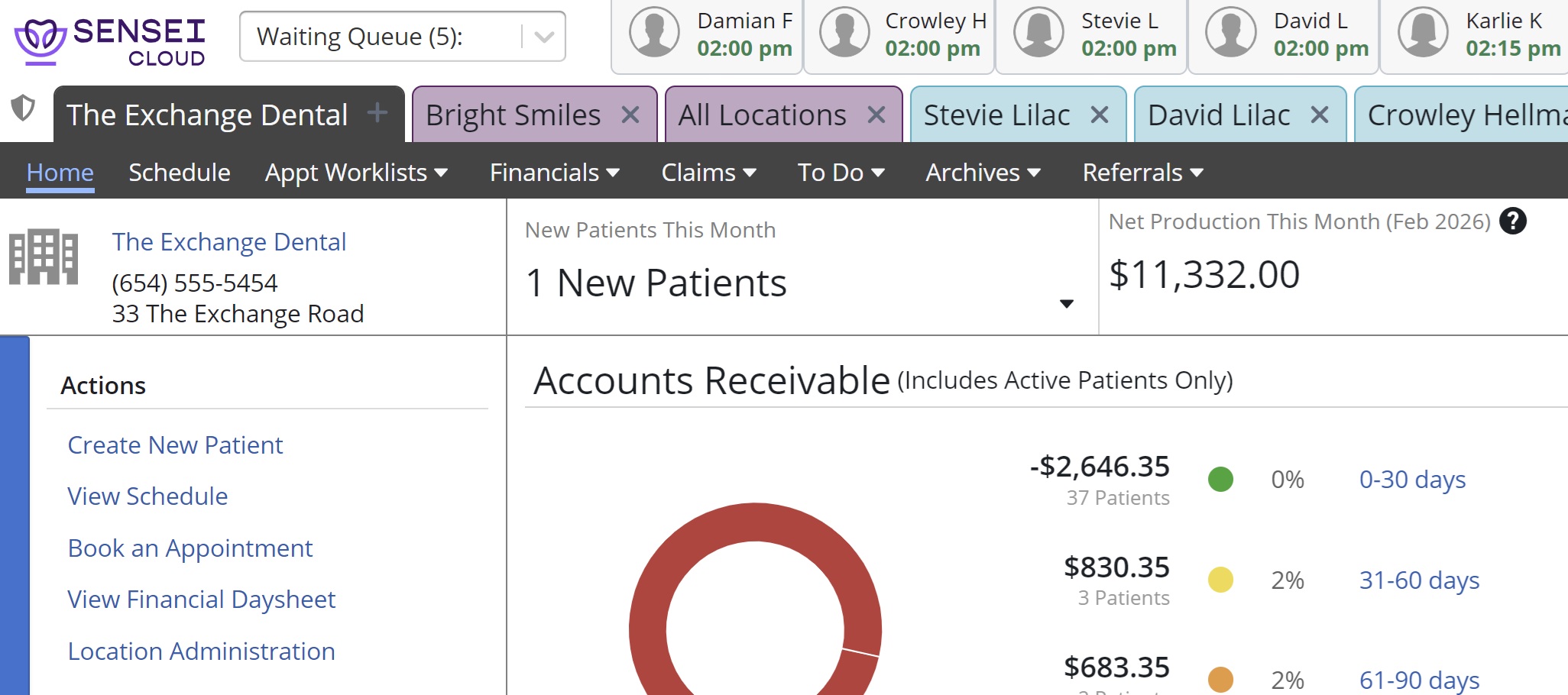 Location tabLocation tab Displays the practice name, with the practice phone number and address below it, under the menu bar. Click + on the Location tab to display other offices in the practice.