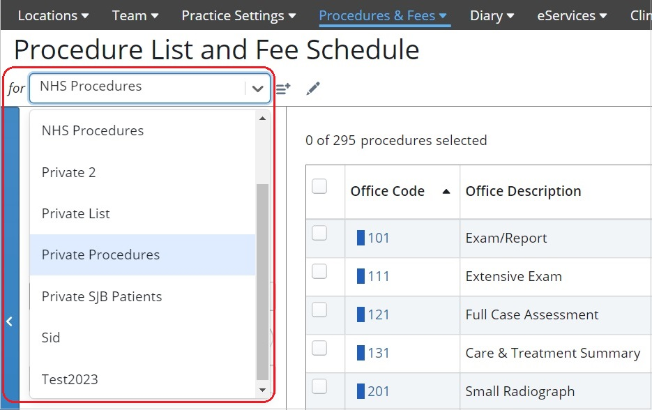 You can select from available private fee schedules/procedure lists when planning, scheduling, and completing non-NHS work.
