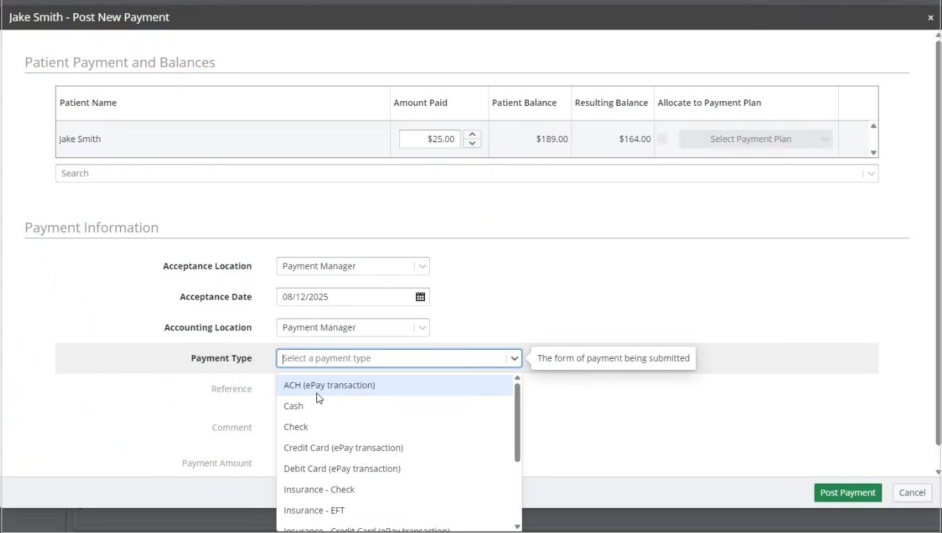 Use one of the methods in Processing Payments to access the Post New Payment window. The patient’s balance is displayed.