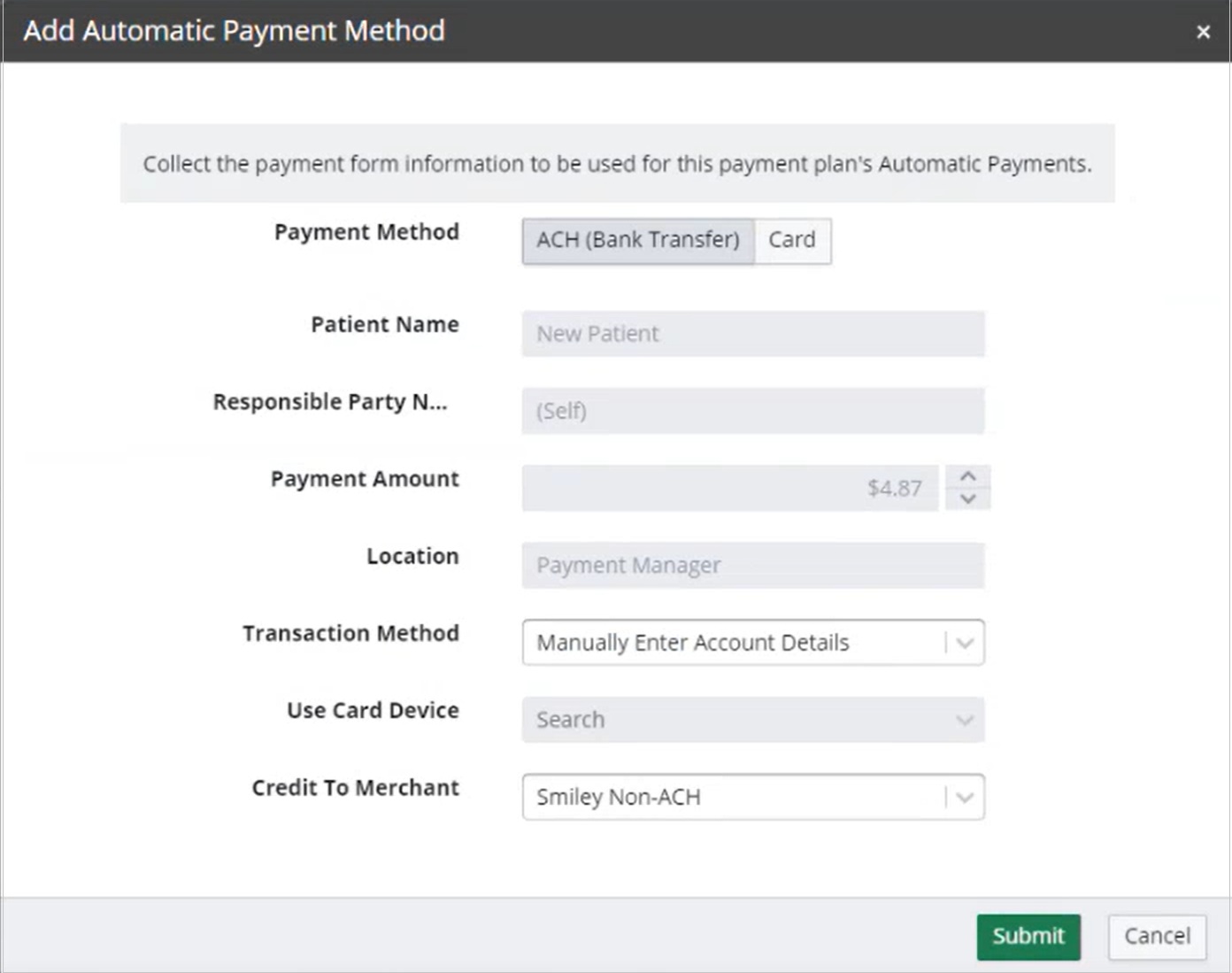 Note: This menu only requires a selection for card payment forms; when ACH is selected, this menu is disabled. If the card is not present or you are handling the setup remotely, select Manually Enter Card Details and follow the on-screen instructions.