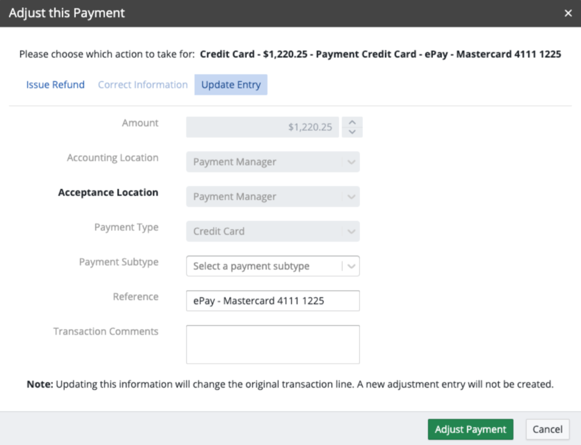 -- If you simply need to update information such as the payment subtype, Reference details, or Transaction Comments, select Update Entry. Make the necessary changes, and then click Adjust Payment.