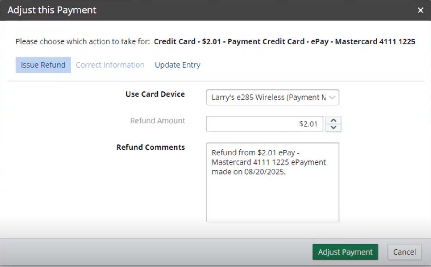 Note: You can post a partial refund for ePayment credit card transactions, or the entire amount can be refunded.