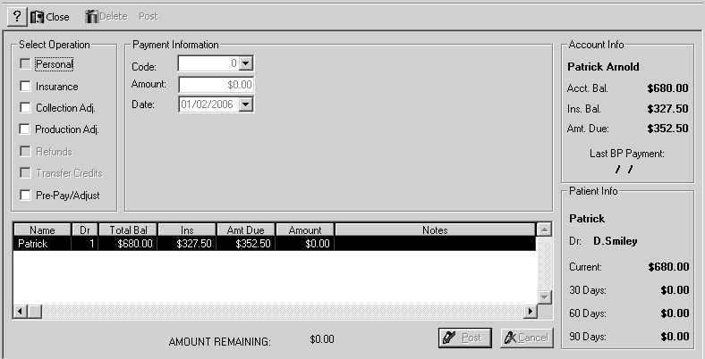 In the Patient List window or the Patient window, select the patient who is submitting payment.