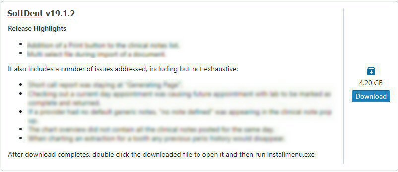 Beginning with version 19.0.1, the SoftDent Installer is available via download from Carestream Dental's Dental Practice Management Software Download Service.