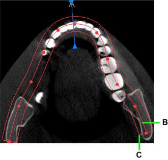 The shaded block above (A) is used to represent thicker slices in the 2D MPR view screen. In other non-orthogonal, specialized view screens (for example, the jaw arch/temporal bone view screen on the Curve tab) slice thickness is represented as a solid line (C) drawn around the curve plane (B).
