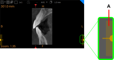 The axial slice handles are changed in the other views. The color-coded shading (A) shows that the slice thickness has changed.